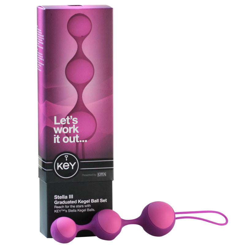 One set of graudated weighted Kegel balls, 20g, 30g, and 45g, wrapped in body safe silicone. Diameter of balls is 1.25 in., 1.5 in. and 1.75 in. One triple ball holder with retrieval loop.