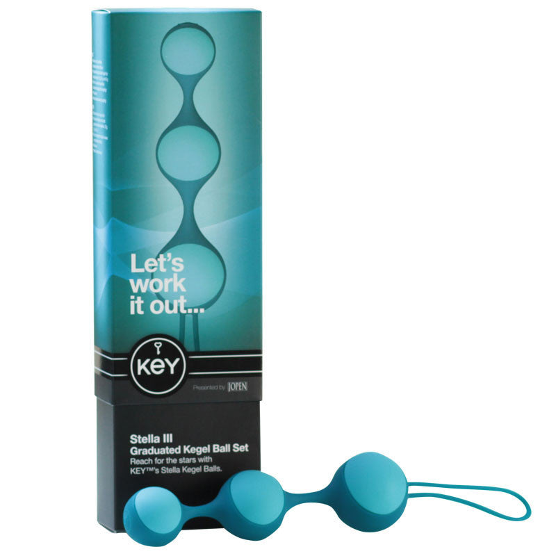 One set of graudated weighted Kegel balls, 20g, 30g, and 45g, wrapped in body safe silicone. Diameter of balls is 1.25 in., 1.5 in. and 1.75 in. One triple ball holder with retrieval loop.