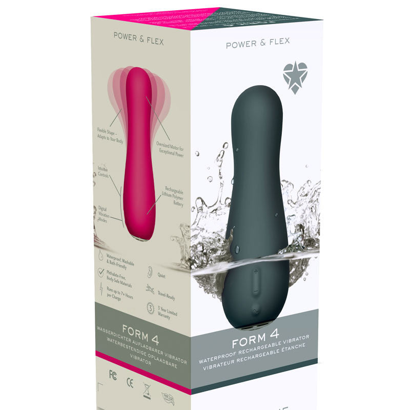 Waterproof vibrator offers deep, rumbling vibration. Combined with a simple and approachable shape, the flexible shape adapts to your body, the over-sized motor provides exceptional power, exactly where you want it most. With four vibration modes and five power levels, the vibrator is recharged by placing it on its base. Lithium ion battery runs more than 4 hours on a single charge. Measures 3.25 in. by 2 in. at widest point.